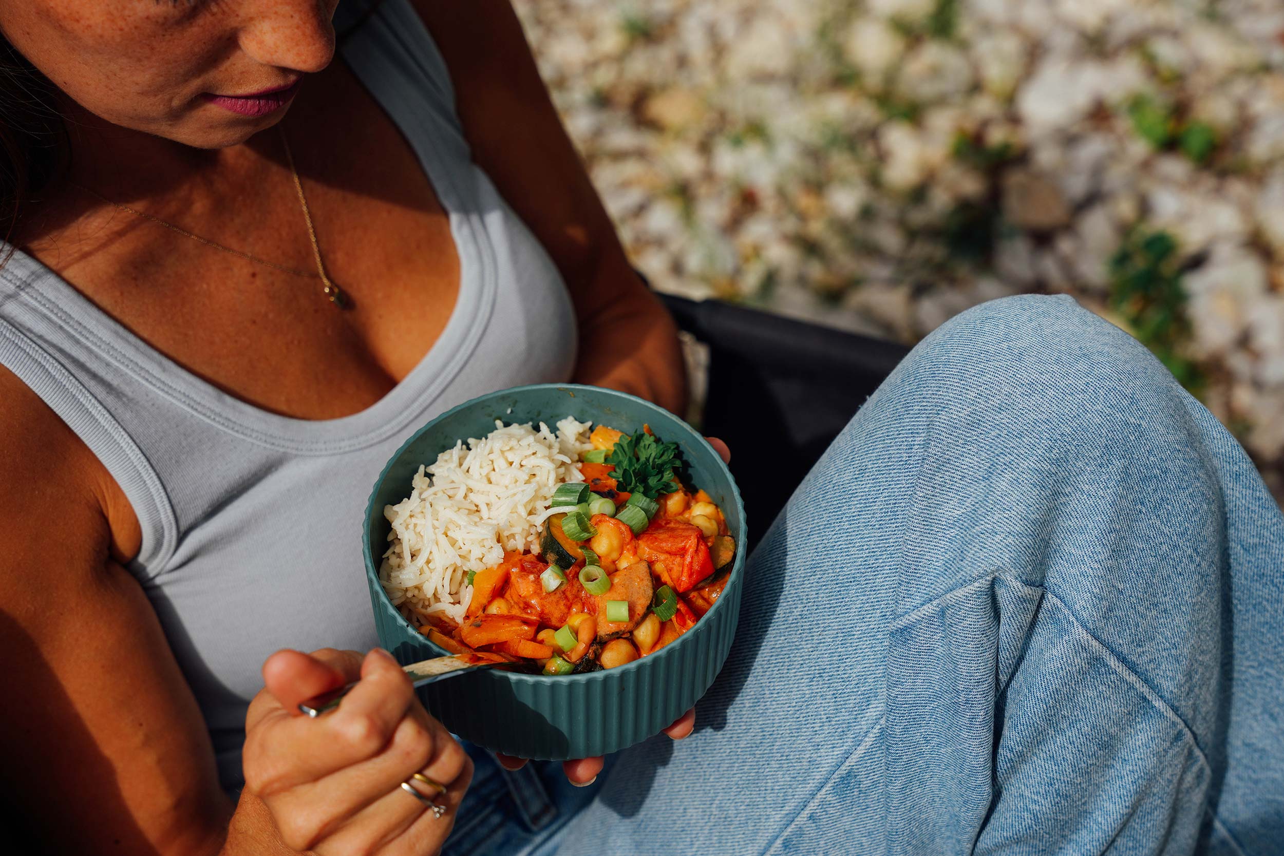Parallel dazu Reis kochen oder Fertigreis erwärmen. Curry mit dem Reis anrichten und mit Frühlingszwiebeln bestreuen.
