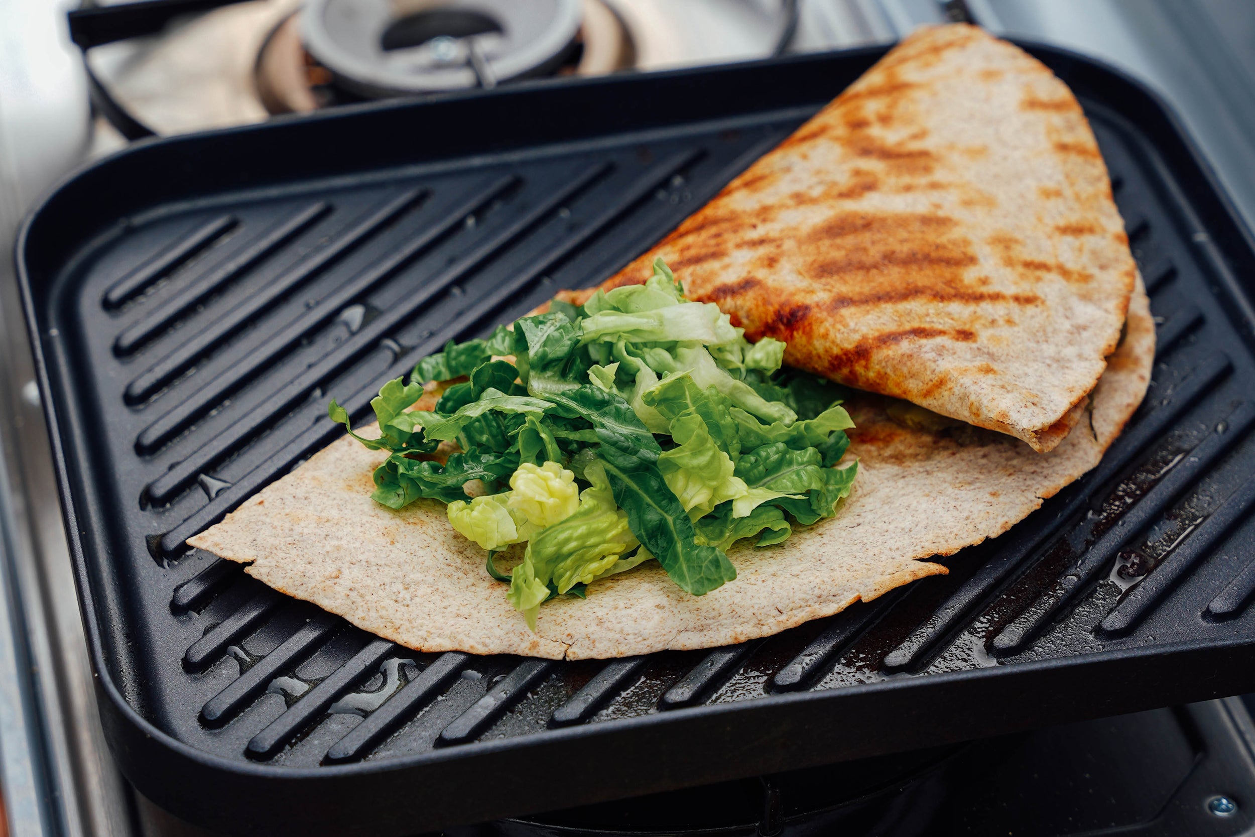 4. Den gefalteten Wrap in einer Pfanne mit etwas Öl oder Butter von beiden Seiten 2–3 Minuten knusprig anbraten, bis der Käse geschmolzen ist.