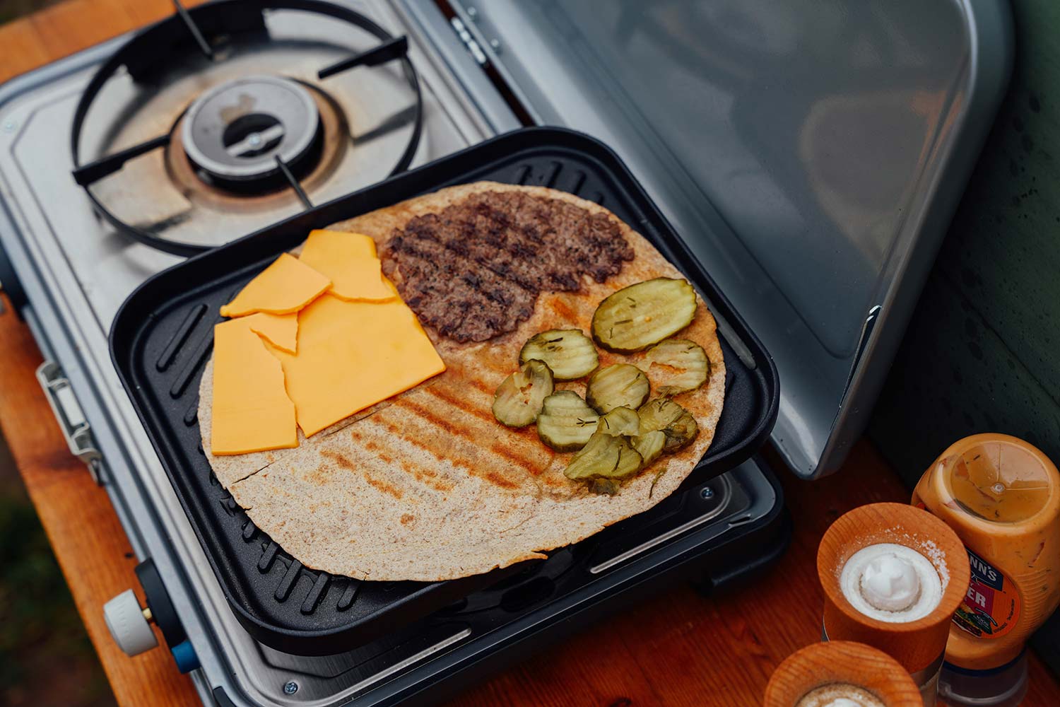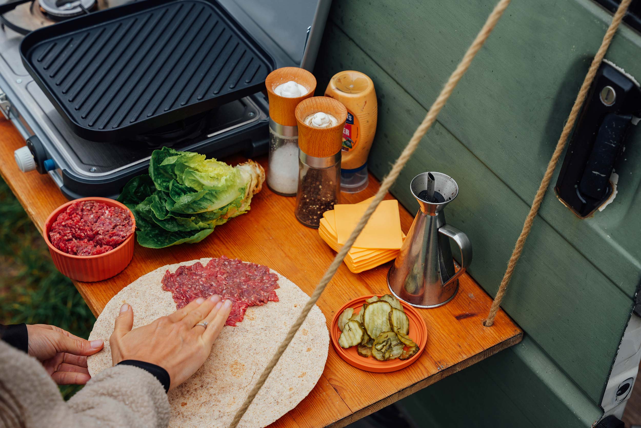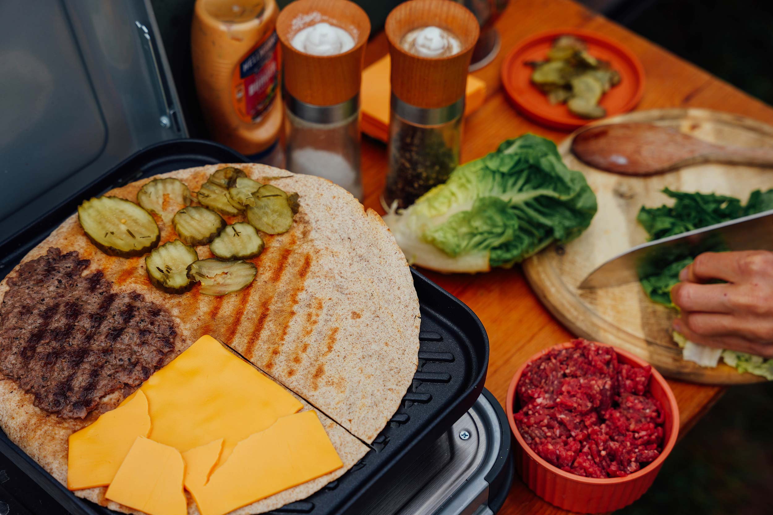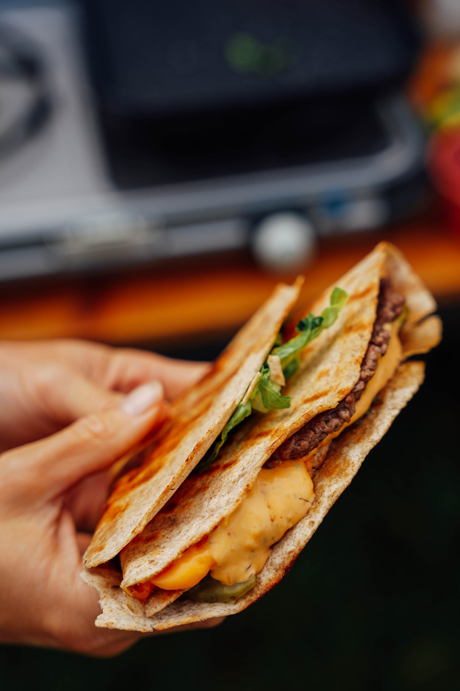 Dieser Wrap vereint alles, was wir am Cheeseburger lieben! Saftiges Hack, geschmolzener Käse, frisches Gemüse und Soße. Durch den Trick mit den „vier Feldern“ wird aus einem einfachen Tortilla ein handliches Paket.