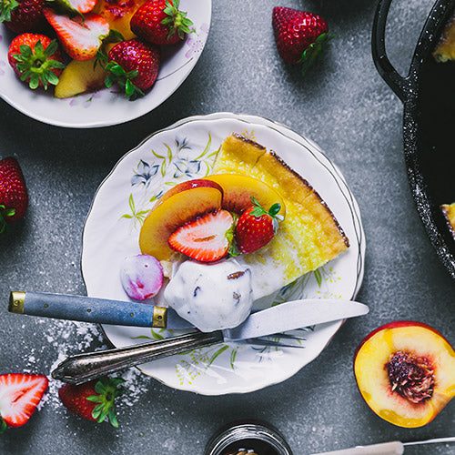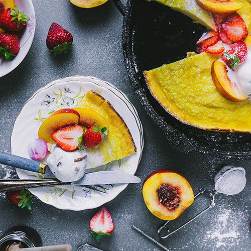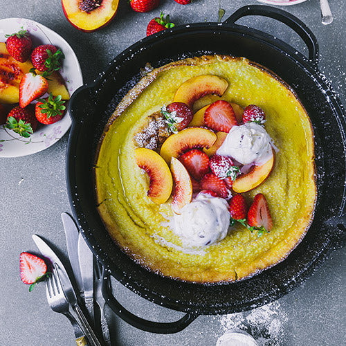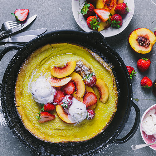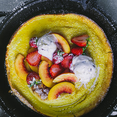 6. Wenn der Teig durch ist, die gusseiserne Pfanne herausnehmen und die Früchte obenauf geben. Der Pfannkuchen wird dabei vermutlich wieder zusammengehen. Mit Puderzucker bestäuben und mit Ahornsirup beträufeln. Je nach Vorliebe Eiscreme hinzufügen und sofort servieren.