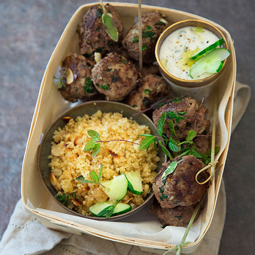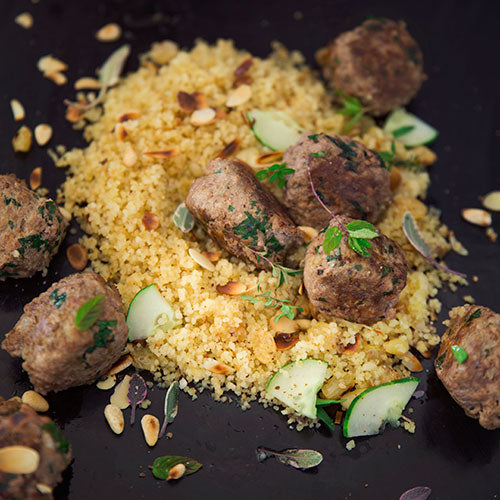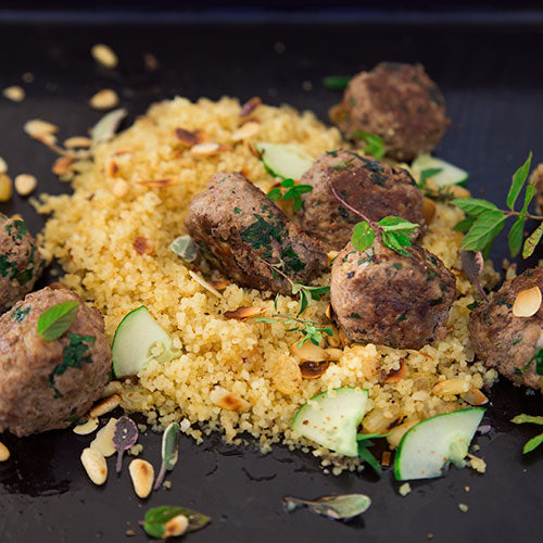 - Die Pinienkerne und Mandeln auf dem Plancha-Grill rösten. Den Grieß und die Rosinen hinzufügen und einige Minuten weiterbraten. Den Grieß mit den Köfte und der Joghurtsoße servieren.