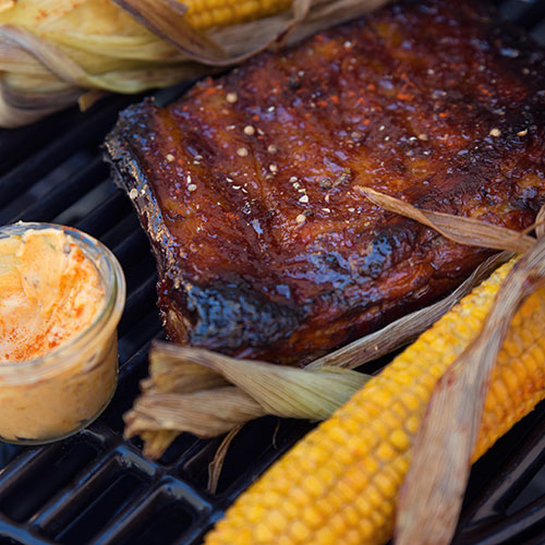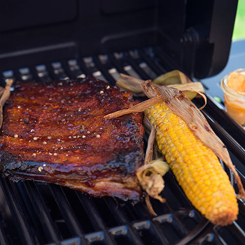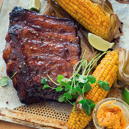 - Die Spareribs mit den Maiskolben und der restlichen Barbecuesoße servieren.