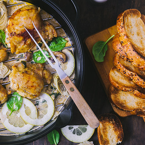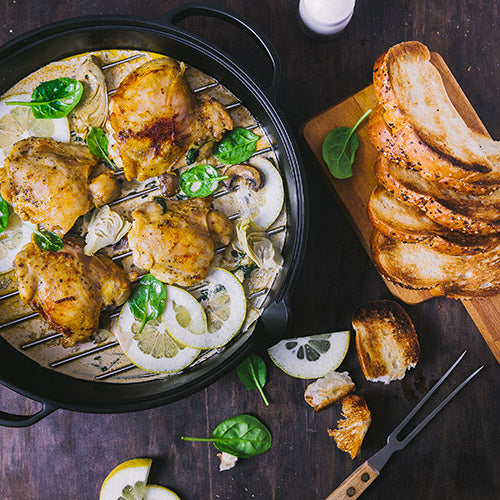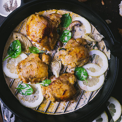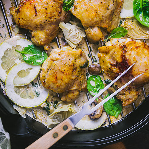 3. Legen Sie die Gusseiserne Pfanne in den Culinary Modular Einsatz und fügen Sie 1 Esslöffel Butter hinzu. Sobald diese geschmolzen ist, legen Sie die Hähnchenschenkel in die Pfanne. Lassen Sie diese einige Minuten auf jeder Seite anbraten, damit Sie eine goldene Farbe erhalten.