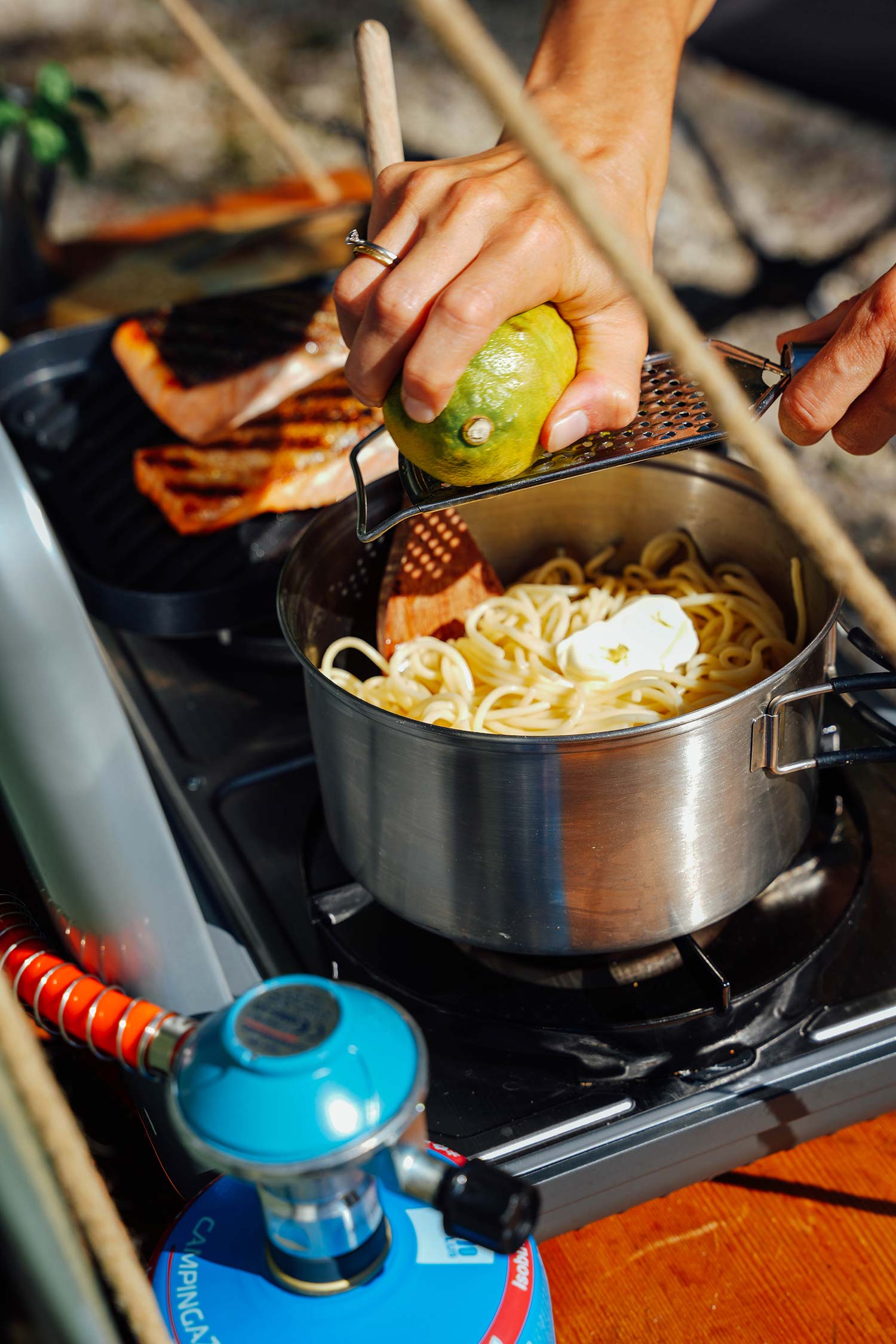 Frische Zitronennote trifft auf cremige Pasta und zarten Fisch vom Grill – ein leichtes, aromatisches Gericht für Camping oder Zuhause. Die Spaghetti werden in einer feinen Zitronen-Butter-Soße geschwenkt, verfeinert mit Parmesan und optionaler Sahne für extra Cremigkeit. Dazu ein perfekt gegrilltes Fischfilet – schnell zubereitet, mediterran inspiriert und voller Geschmack!