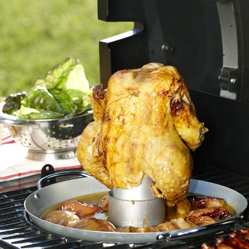 - Place the chicken on the chicken roasting pan and arrange the butter flakes and apples in the ring around the chicken. Let the chicken roast for about 15 minutes, then drizzle with the chicken stock and apple cider. Repeat this process for the next 45-55 minutes until the chicken is fully roasted.