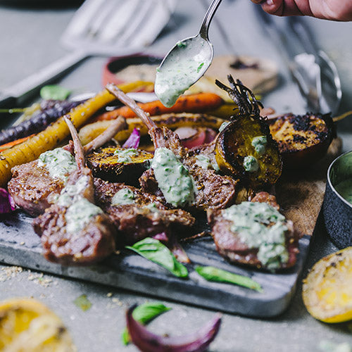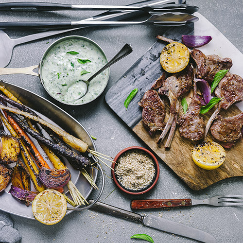 5. Once the vegetables are roasted, heat the grill and spray it with oil. Add 1 tablespoon of oil and 1 teaspoon of salt to the lamb chops. Brush the lamb chops with the dukkah spice mix and grill for a few minutes on each side. Cut the lemon in half and heat it as well.