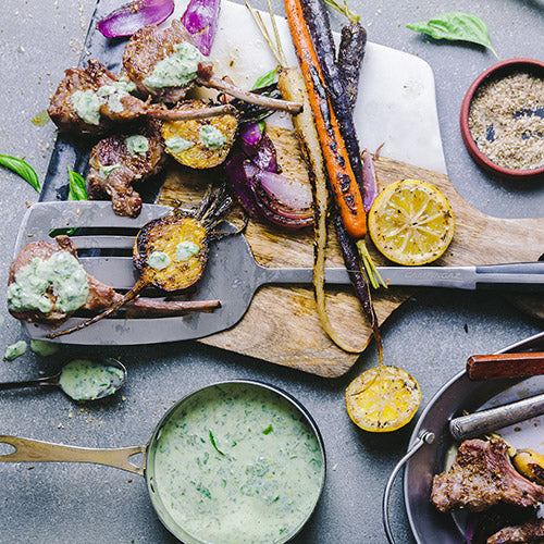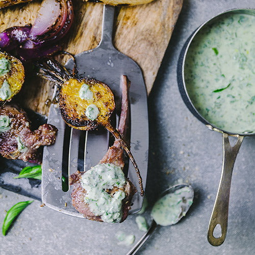 Grilled tender lamb from the gas grill meets a refreshing basil yogurt sauce