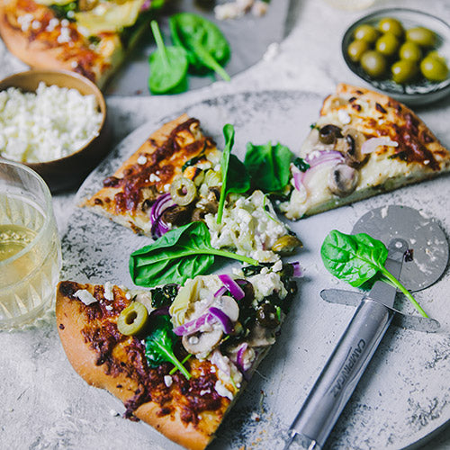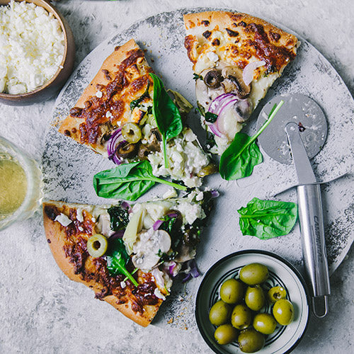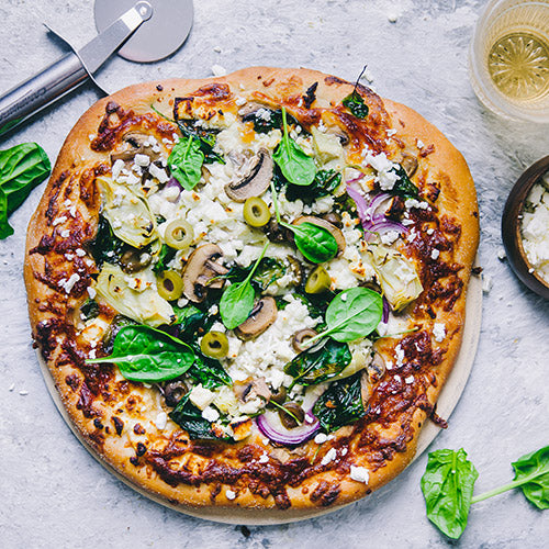 7. Spread with hummus and sprinkle half of the mozzarella cheese on top. Top with onion, spinach leaves, artichoke hearts, mushrooms, and olives. Sprinkle the remaining mozzarella and feta cheese on top. Drizzle a little olive oil evenly over the pizza.